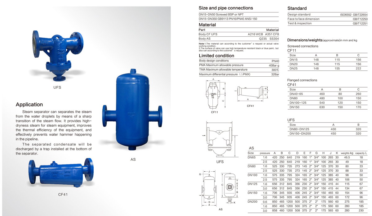 汽水分離器為壓力容器結構碳鋼或不銹鋼設備,須安裝于水平管線上,排水口垂直向下,所有口徑的汽水分離器均帶安裝支架,以減小管道承載。為確保被分離的液體迅速排放,應在分離器底部的排水口連接合適的一套疏水閥組合。 汽水分離器用于蒸汽、壓縮空氣及其它氣體系統可除去蒸汽、空氣或氣體等系統中所含水分。本類閥門在管道中一般應當水平安裝