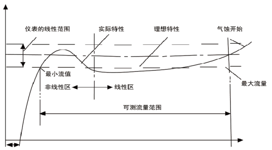 流量計的系數與流量(或靂諾數)的關系曲線如下圖所示。 由圖可見, 儀表系數分為二段, 即線性段和非線性段。 線性段約為其工作段的三分之二, 其特性與傳感器結構尺寸及流體粘性有關。非線性段特性受承軸摩擦力, 流體粘性阻力影響較大。 當流體量低于傳感器流置下限時, 儀表系數隨著流噩迅速變化。 當流噩超過流噩上限時要注意防止氣蝕現象。