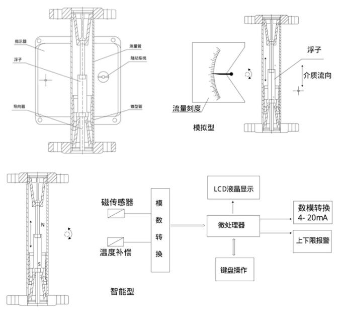流量計主要有三大部分組成:1.測量管體;2.錐形浮子;3.指示器。浮子的位移量與流量大小成正比,通過磁耦合系統,以不接觸方式,將浮子位移量傳給指示器指出流量大小。也可配合不同的轉換器,將流量值轉換成標準的電遠傳信號如4-20mA。實現距離遠傳顯示、記錄、積算和控制等功能。