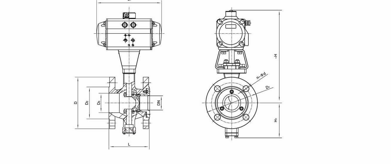 進口氣動對夾式調節球閥結構尺寸: