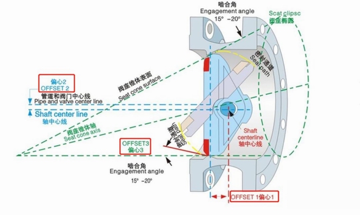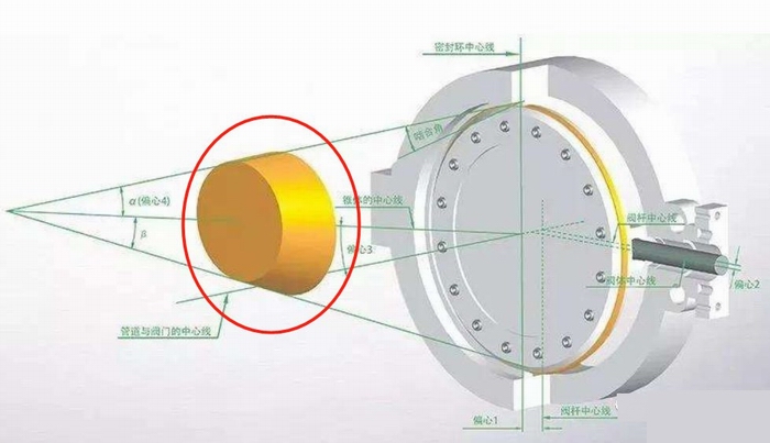 第三道偏心,密封面回轉軸線與閥體通道軸線偏心