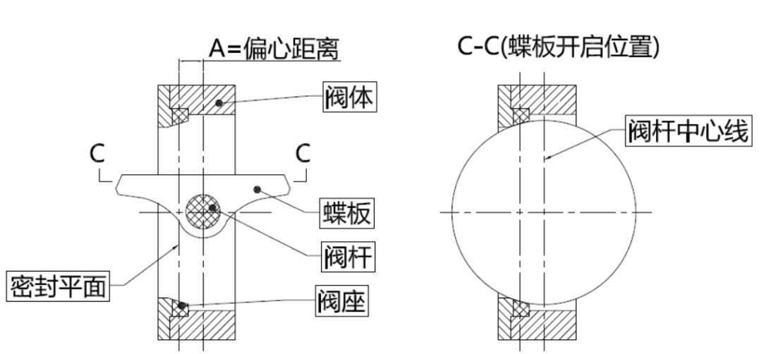 蝶板的閥桿中心與蝶板密封截面按A偏心設(shè)計,蝶閥在開啟過程中,蝶板密封面逐漸脫離閥座密封面;