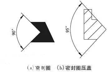 為了在升壓初期密封圈處不發(fā)生內(nèi)漏,將密封圈做成90°的V 形口,密封圈壓蓋做成95°的V 形面(圖2) 。在碟簧預(yù)緊力作用下,利用密封圈壓蓋和密封圈之間的角度差,密封圈受到壓緊力后,開口適度增大,在徑向方向貼緊閥體和閥座,如果在有介質(zhì)作用力下,V 形開口也會增大,這樣會貼合更緊,密封效果更好。密封圈與閥座接觸的面做成斜面,便于增大接觸面的密封長度。為了使閥門滿足425°C 高溫狀態(tài)的工作要求,密封圈材料選擇編織或增強(qiáng)柔性石墨,碟簧材料選擇60Si2MnA 或Inconel。